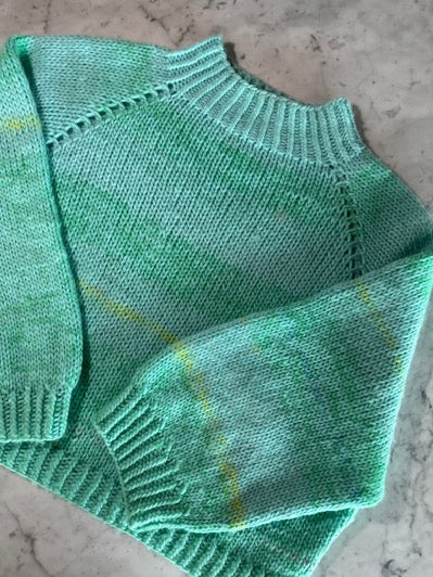 Peysan er prjónuð ofan frá og niður með laskaermum. Prjónað er með tveimur þráðum og hægt að leika sér með mohair litina. Mikil yfirvídd er í peysunni.