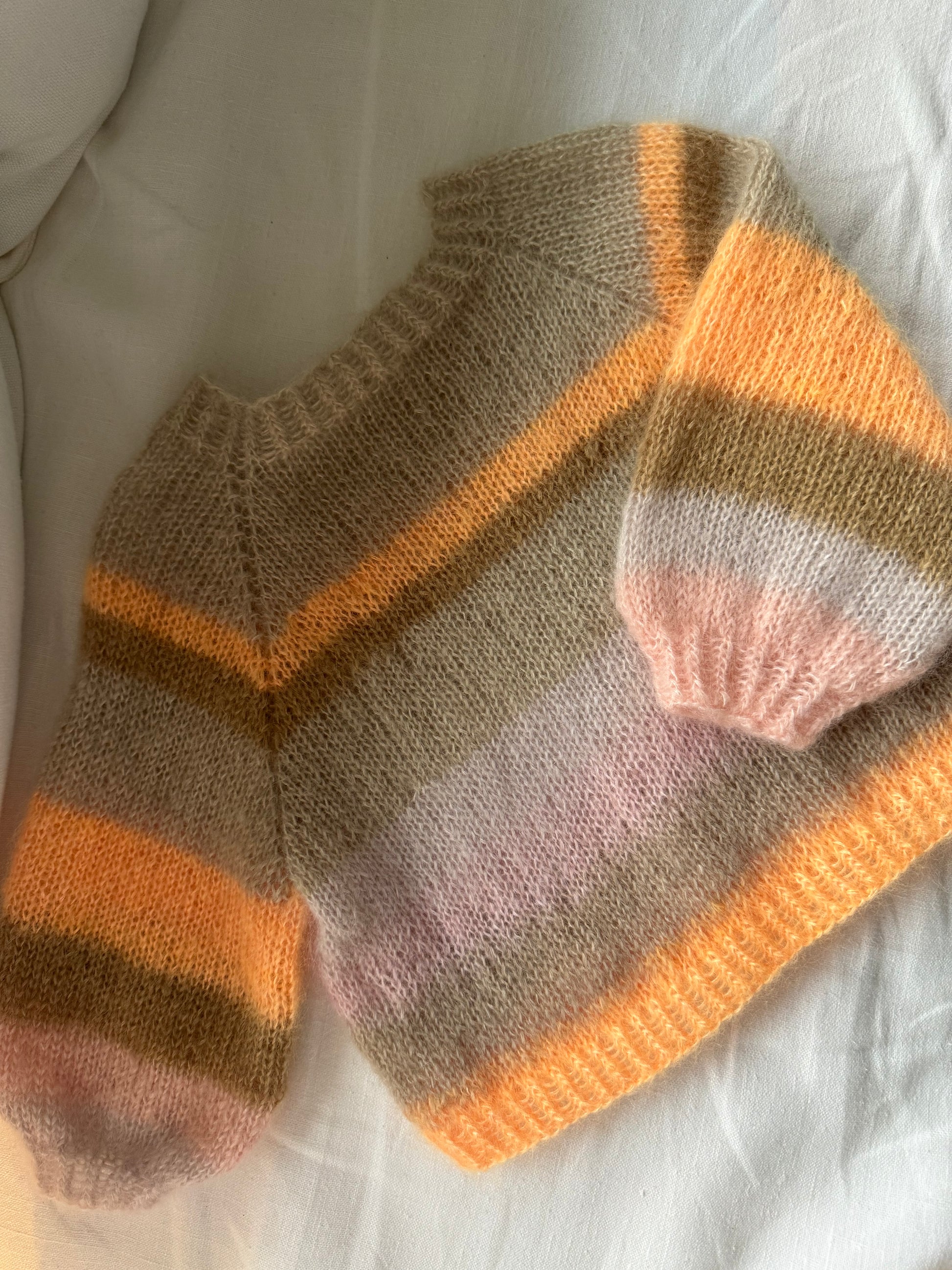 Peysan er prjónuð ofan frá og niður með laskaermum, lykkjan á milli laskaútaukningu er alltaf prjónuð brugðin. Prjónað er með tveimur þráðum af silki mohair garni.